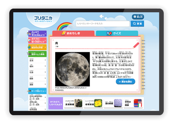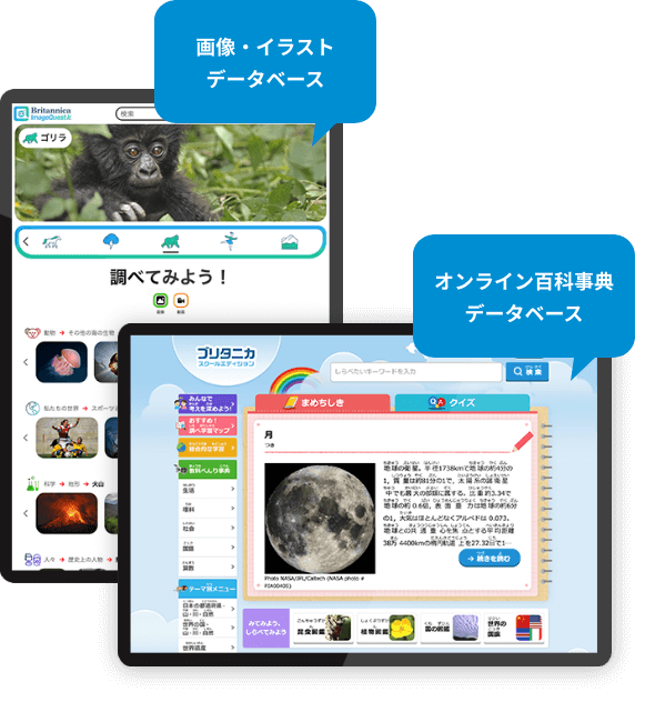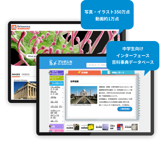 中学生以上対象に、詳細な350 万点以上の貴重な写真・イラストと、約1万点の動画プラットホーム『ブリタニカ・イメージクエスト』と、中学生向け百科事典プラットホーム『ブリタニカ・スクールエディション』を搭載。
