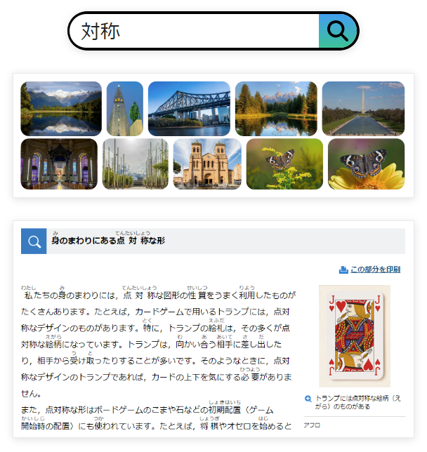 ブリタニカ・イメージクエストジュニアの検索バーに「対称」と入れて、検索結果の画像を線対称な形と点対称な形で分類しよう。